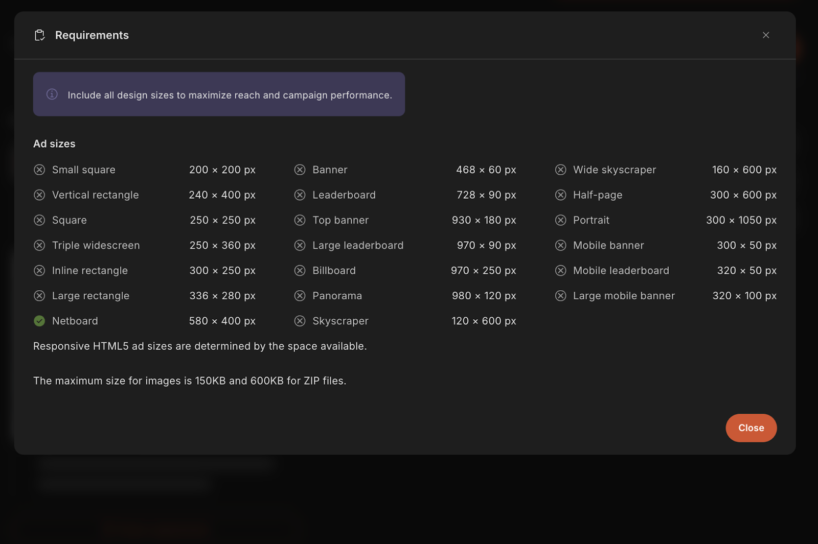Keep in mind that no matter which platform you choose, the requirements of the network apply here as well, including the ones referring to ad dimensions and weight.