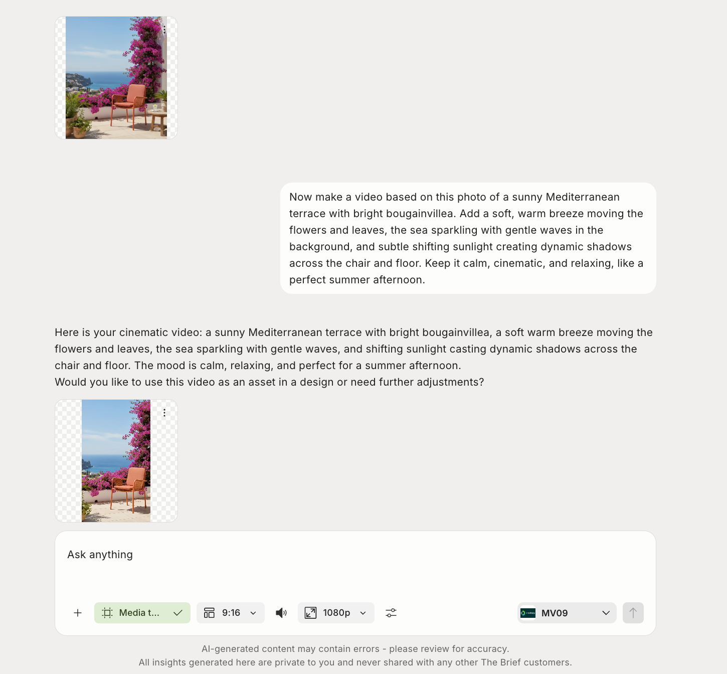 We’ve used a photo of a chair on a sunny Mediterranean terrace with bougainvillea. - Add animation with a prompt
