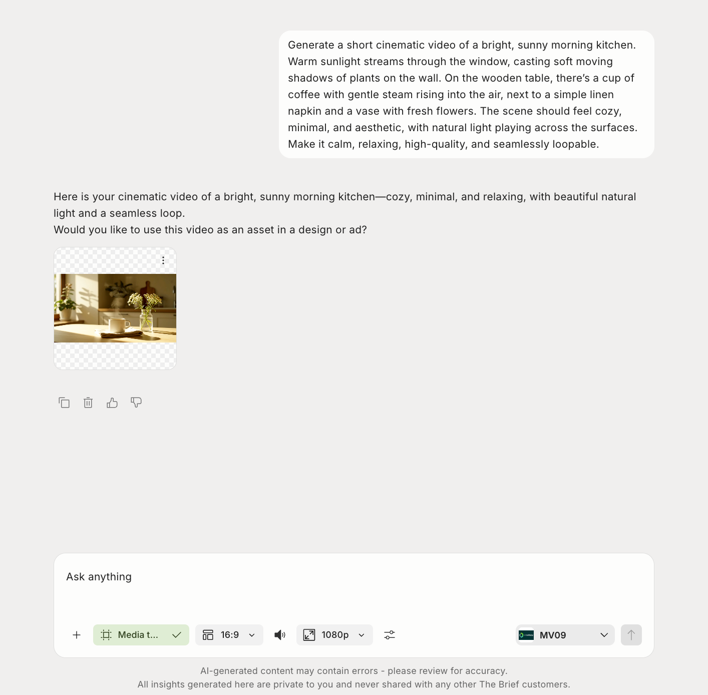 “Generate a short cinematic video of a bright, sunny morning kitchen. Warm sunlight streams through the window, casting soft moving shadows of plants on the wall. On the wooden table, there’s a cup of coffee with gentle steam rising into the air, next to a simple linen napkin and a vase with fresh flowers. The scene should feel cozy, minimal, and aesthetic, with natural light playing across the surfaces. Make it calm, relaxing, high-quality, and seamlessly loopable.” - Result