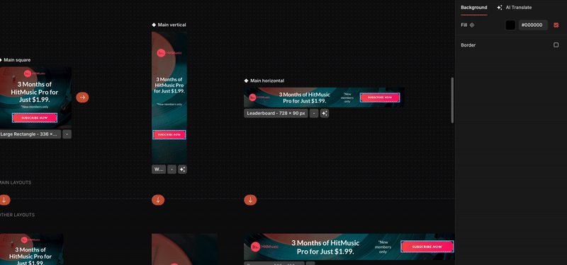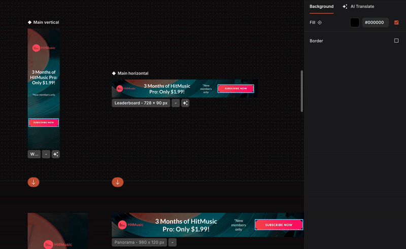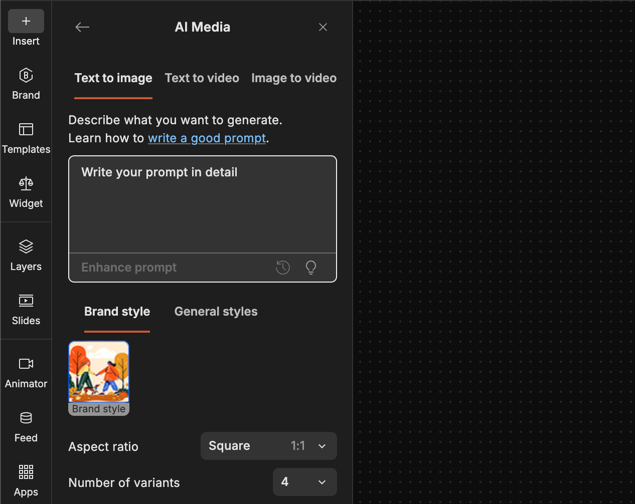Note¹'²'³: Every image you select will automatically be added to your design, and once that happens, it also gets added to the Brand Kit linked to the creative(s) you're currently working on in the AI-generated images folder. You can also save the remaining generated images by hovering over them, clicking the icon, and selecting Save to Brand Kit or Download. All other generated images will disappear once you finish your design or leave the editing stage. You can continue editing your design; the images you generate will remain in the AI image menus.