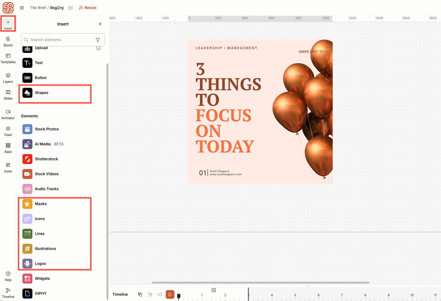 To open the graphic elements library, go to the sidebar, go to Insert, and select the type of element you wish to add to your creative. No matter what graphic element you’ve chosen, you can use the search bar and filters to find exactly what you want.