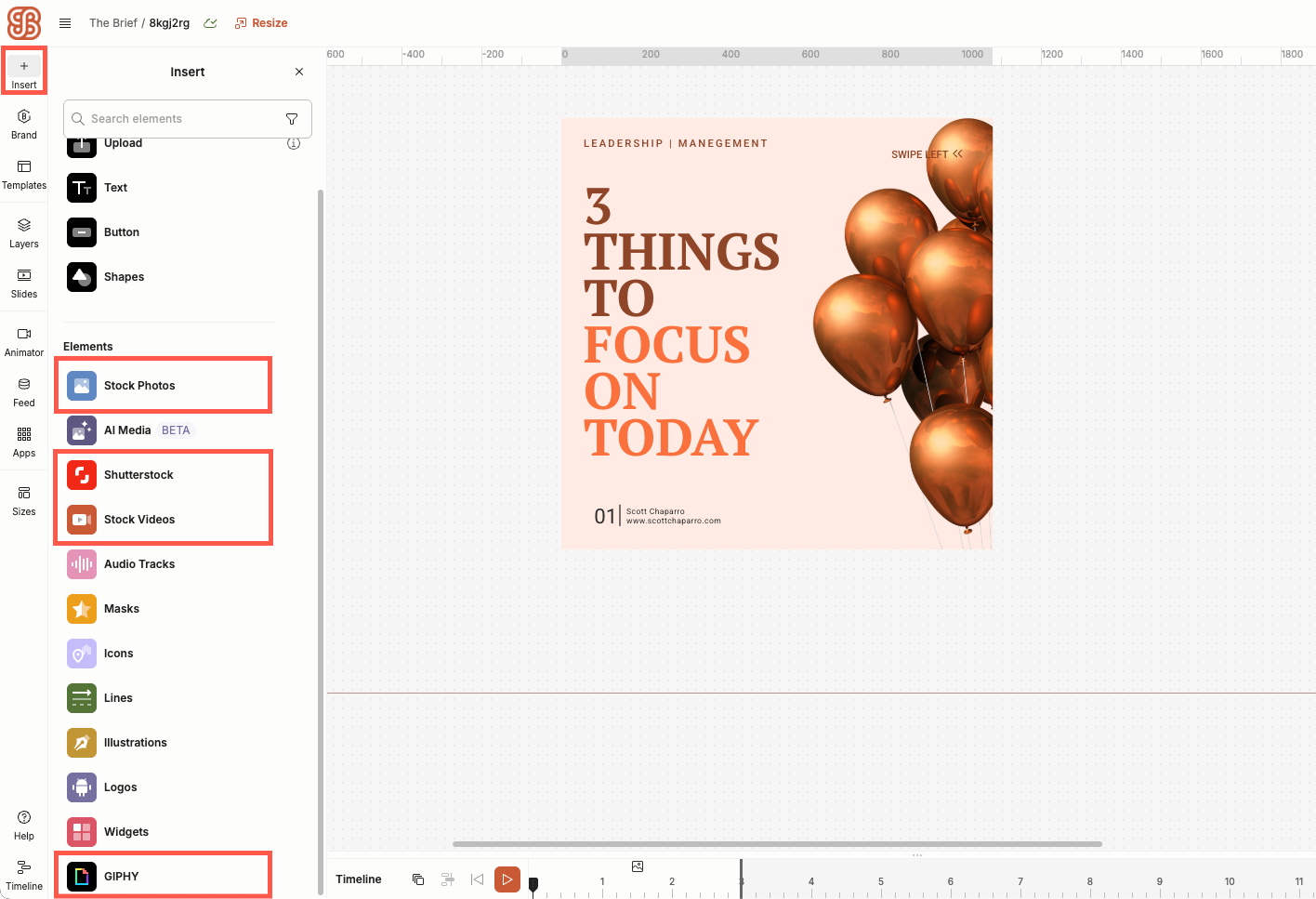 To open the media elements library, go to the left sidebar, click Insert, and select the type of element you wish to add to your creative. No matter what media element you’ve chosen, you can use the search bar and filters to find exactly what you want.