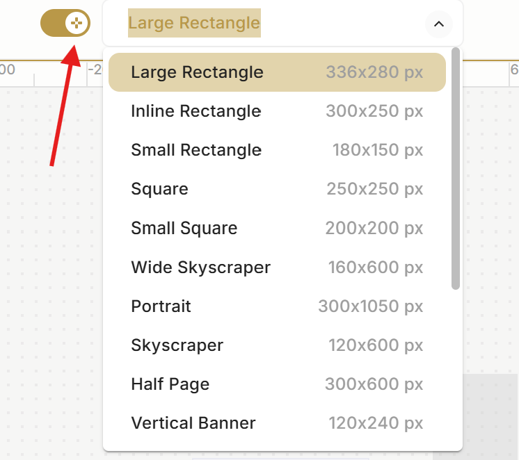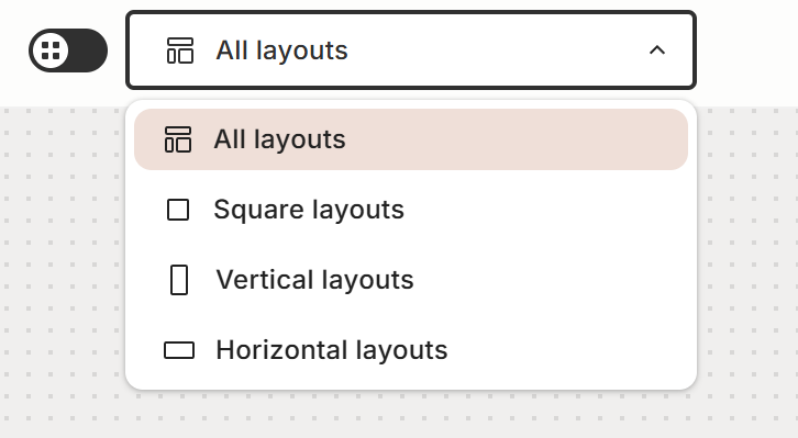 The Layout selector in Ad Studio, found at the top bar's center, allows you to filter layouts on the stage. It offers the flexibility to work with multiple sizes simultaneously or concentrate on a single size.
