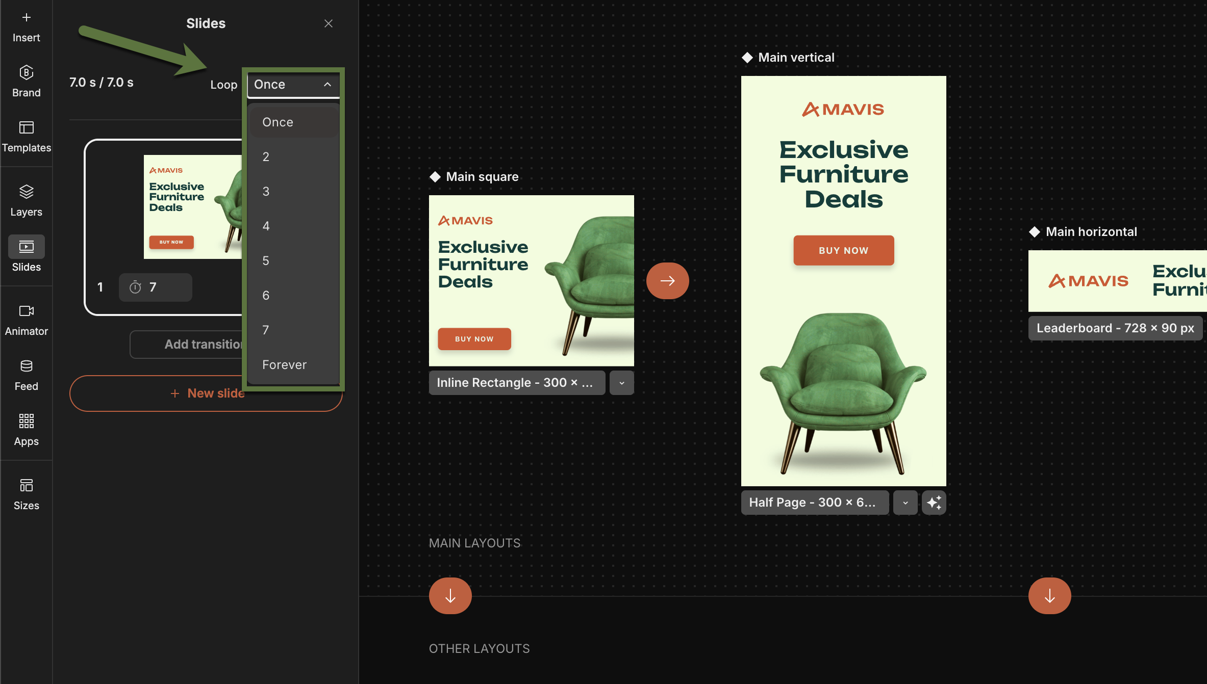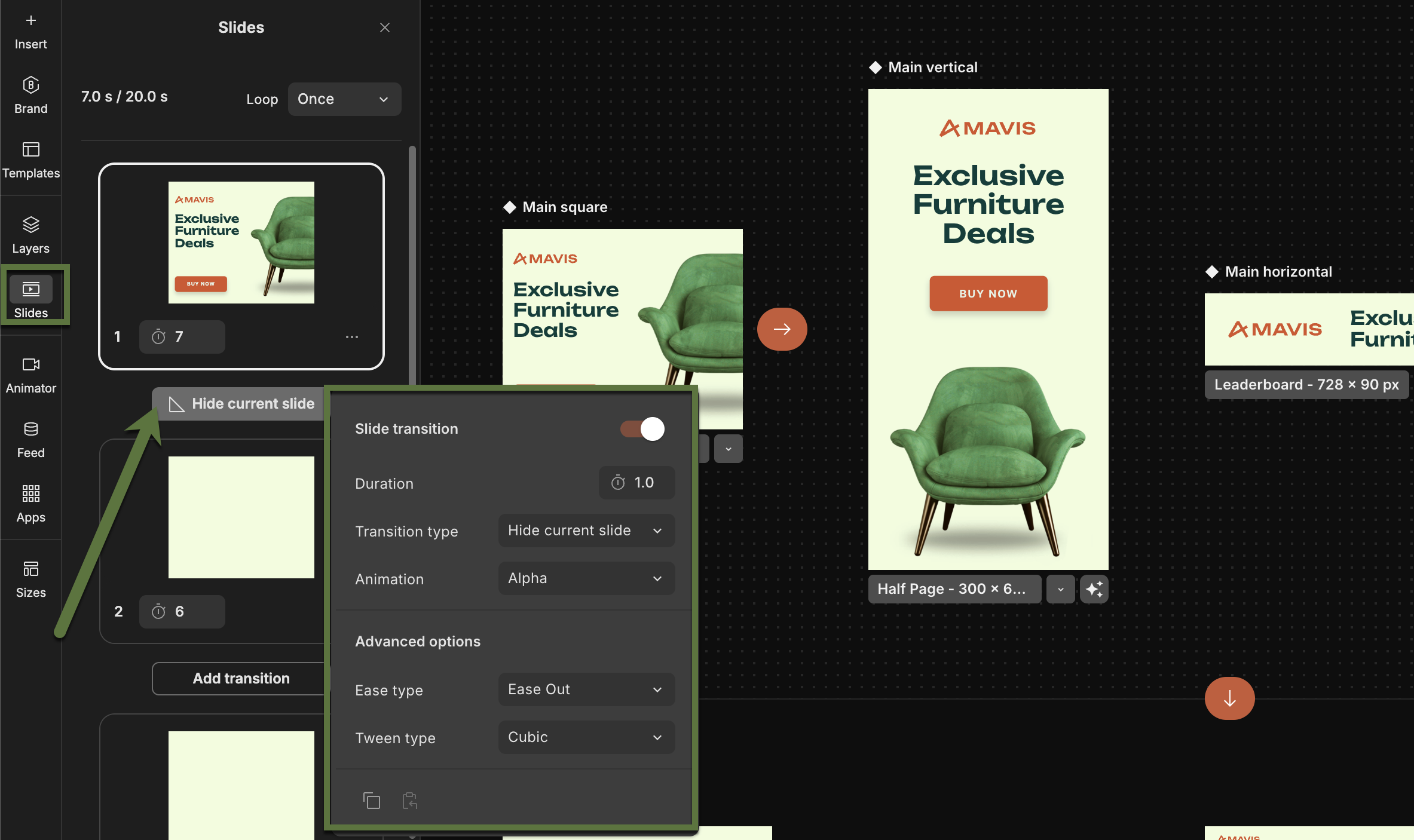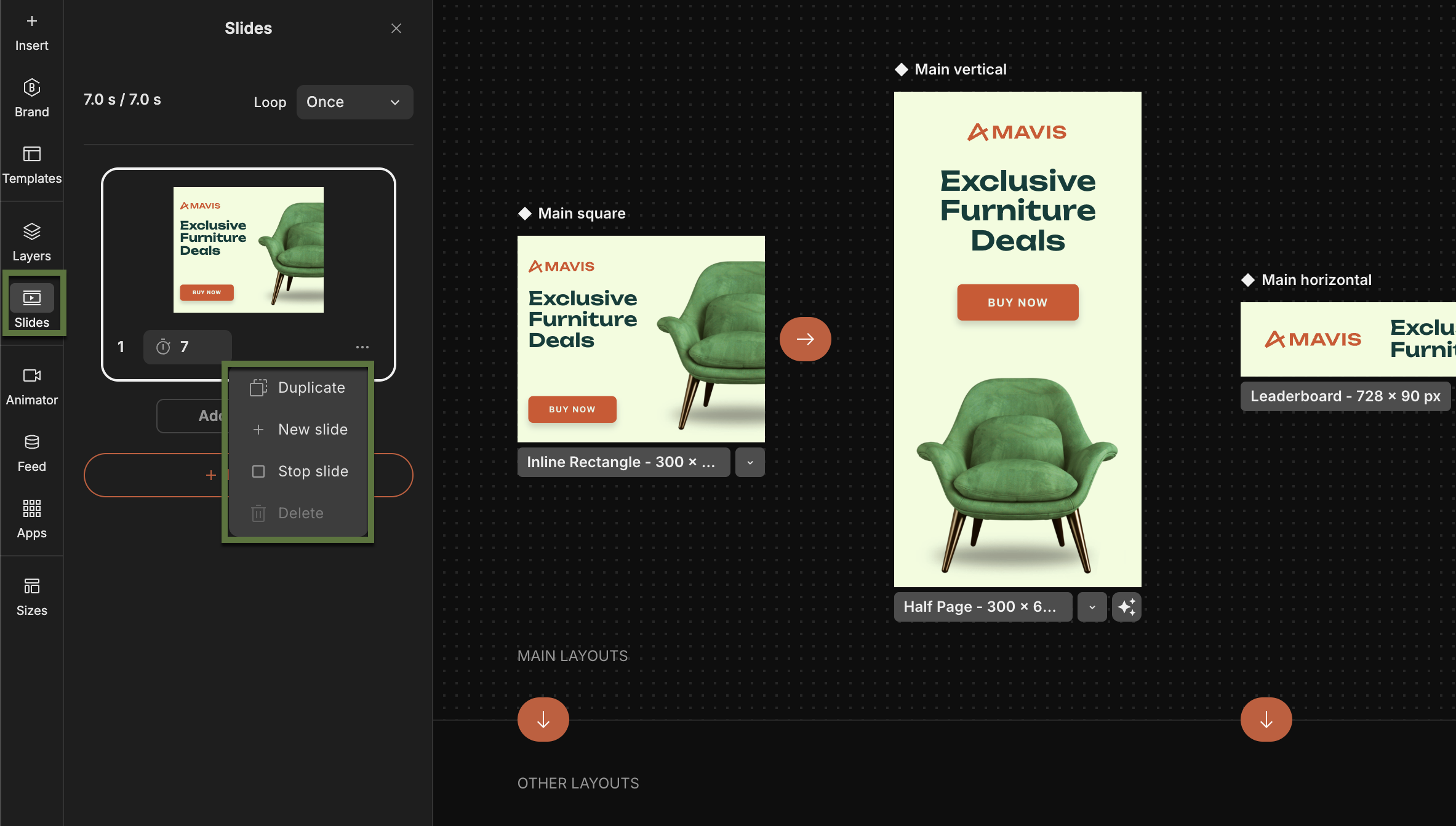 You can add more slides to your design from the left sidebar. The slides management option menu becomes available when clicking on the Slides tab. This is where you can add, remove, and customize the slides in your ad.